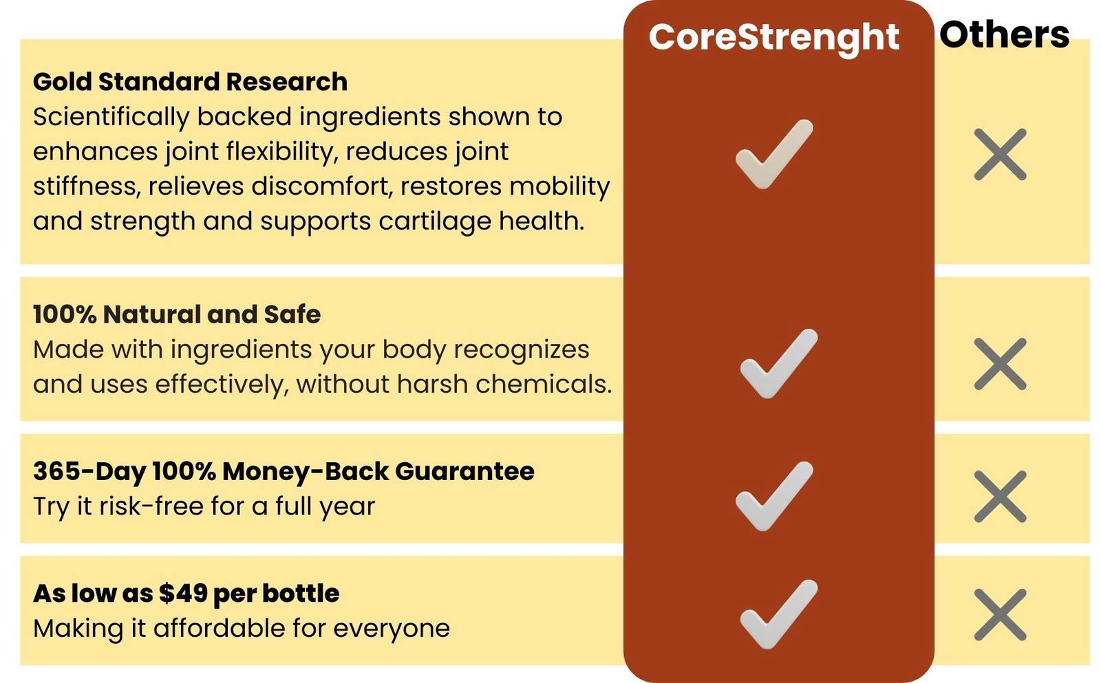 And with our 365-day, no-questions-asked money-back guarantee, CoreStrength offers a completely risk-free way to support long-term joint comfort, mobility, and structural support—naturally, safely, and effectively.